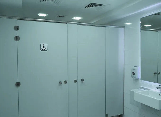 Cleanroom-grade partitions were installed in treatment areas, while patient toilets were equipped with full HPL cubicle systems and urinal partitions. The final result was a safe, efficient, and aesthetically comforting healthcare facility.