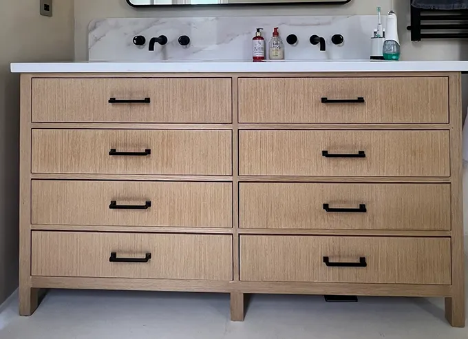 Bedrooms included full-height wardrobes with integrated lighting, drawer systems, and mirror inserts. Bathrooms used HPL and anti-fungal joinery. Acoustic panels were applied in the home office and bedroom zones to ensure a quiet environment.