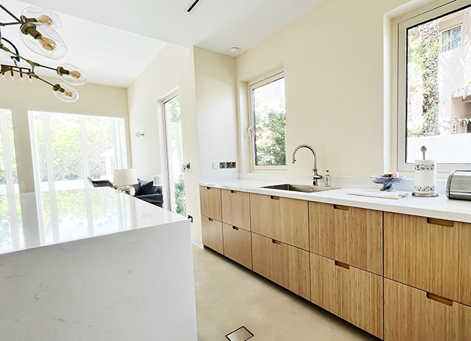 Living spaces featured open shelving, floating media units, and indirect lighting to create a cozy ambiance. The kitchen was custom-built with melamine cabinetry and quartz counters, with hidden storage and appliance housing.
