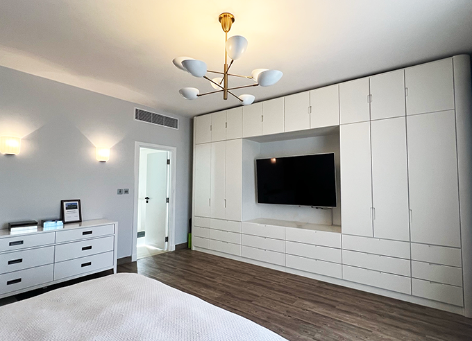 Bedrooms included full-height wardrobes with integrated lighting, drawer systems, and mirror inserts. Bathrooms used HPL and anti-fungal joinery. Acoustic panels were applied in the home office and bedroom zones to ensure a quiet environment.